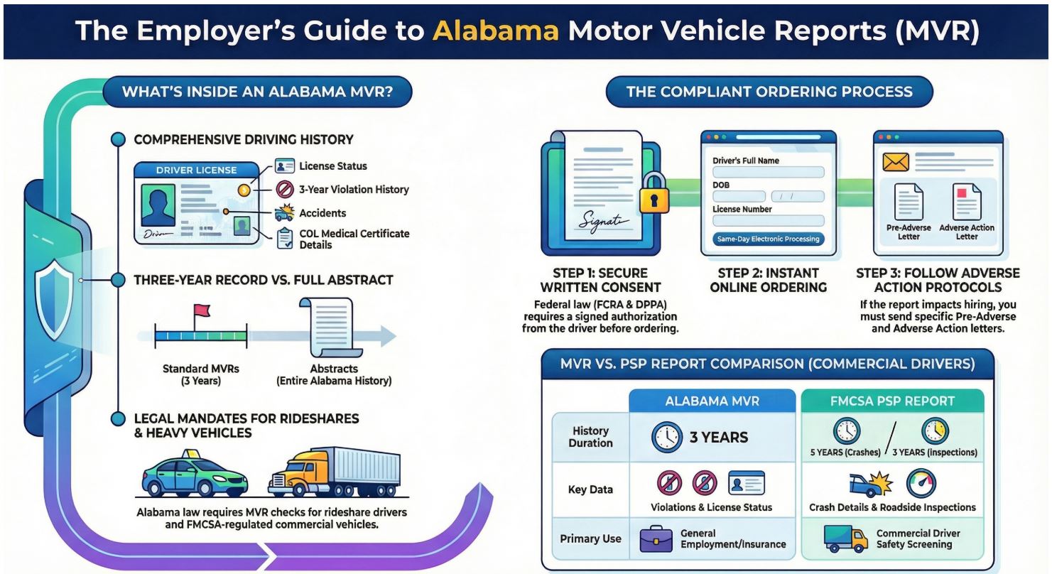 Alabama Driving Records (AL MVRs) are essential for safety managers at trucking companies, delivery fleets, and service businesses across Alabama who must meet strict DOT and FMCSA compliance requirements. Through our secure online system, you can instantly access Alabama MVR reports for both CDL and non-CDL drivers, making it easy to perform pre-employment screening and annual driver reviews in accordance with Federal Motor Carrier Safety Administration regulations.