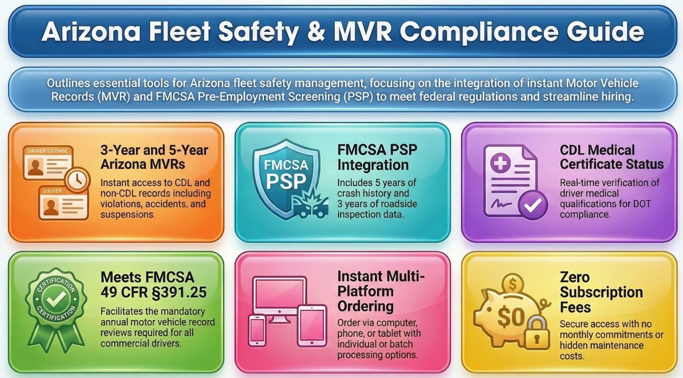 Safety managers can order Arizona driving records online from a computer, phone, or tablet, with no monthly subscriptions or hidden fees. Our system supports individual orders or batch processing, making it easy for trucking companies to manage driver qualification files and DOT safety audits efficiently.